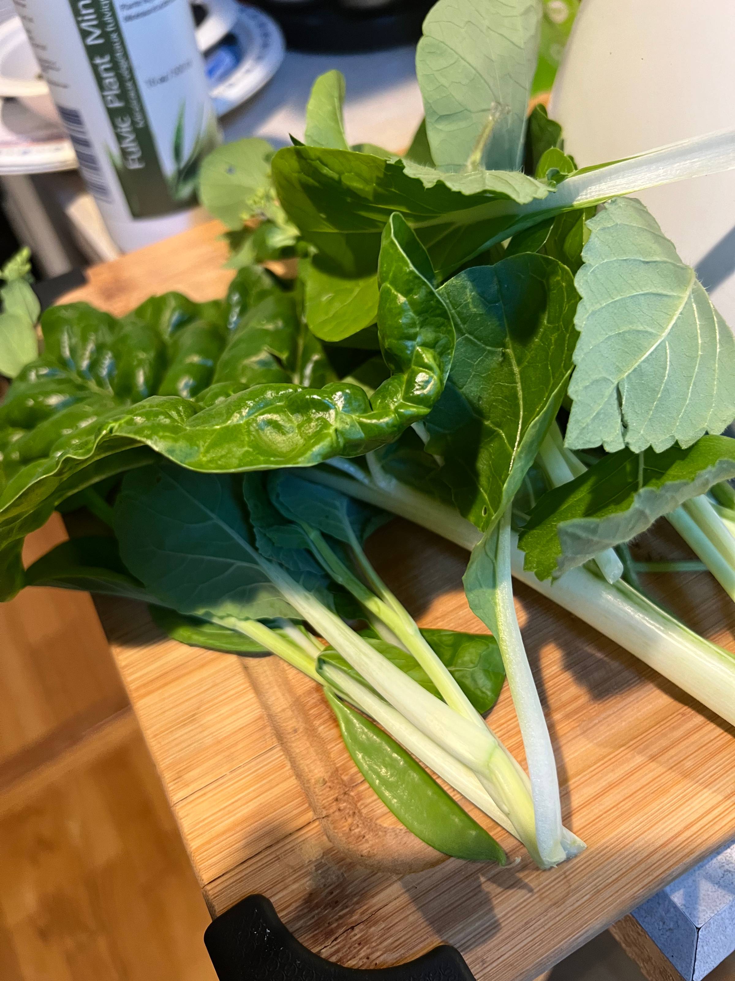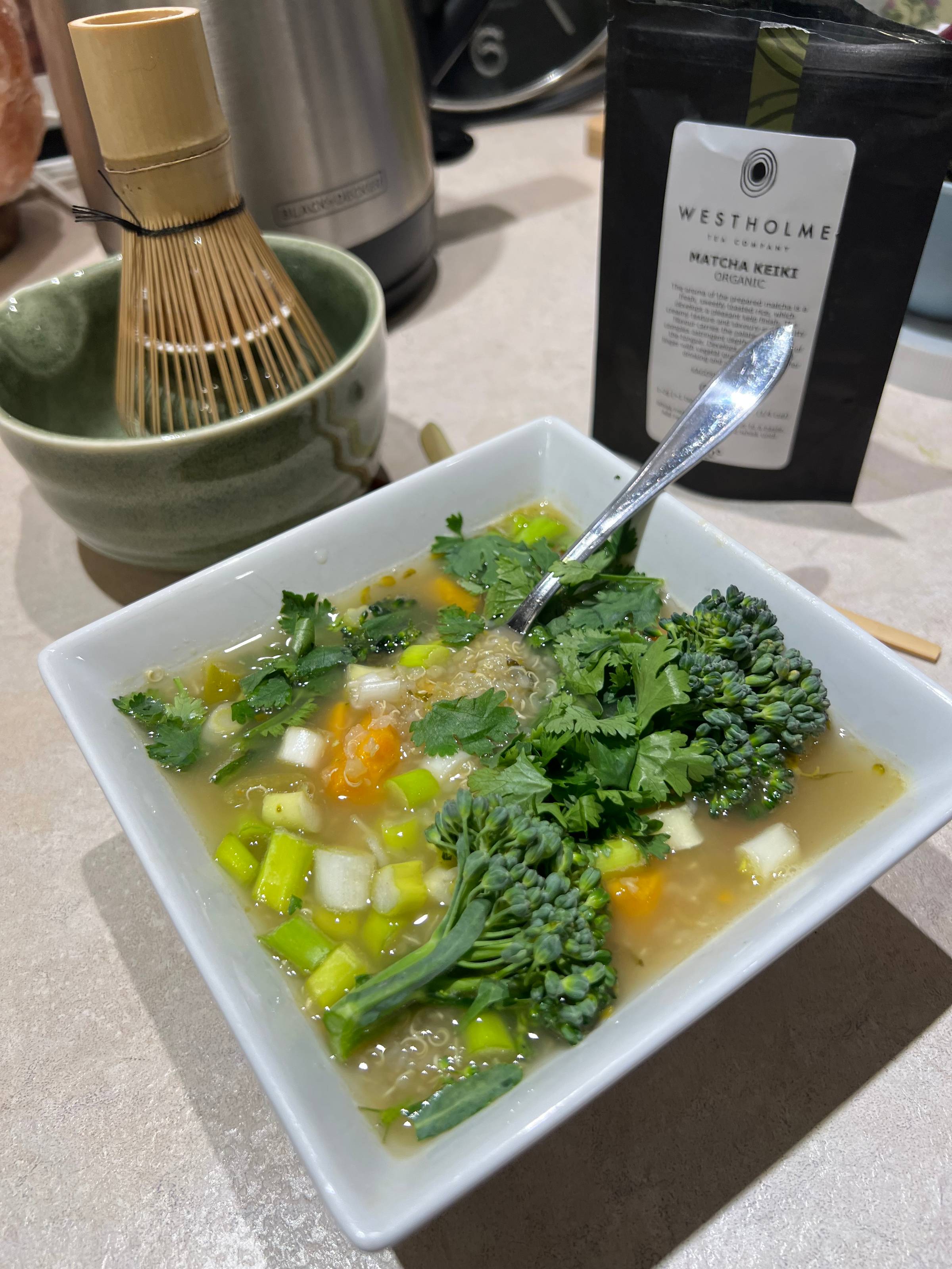 Bring broth and veggies to a boil, simmer the vegetables until cooked through. Add the fresh cilantro, parsley, onions and broccolini, to your bowl once the carrots, onion, yams, bok choi, and celery are cooked through. Serve with a side salad.