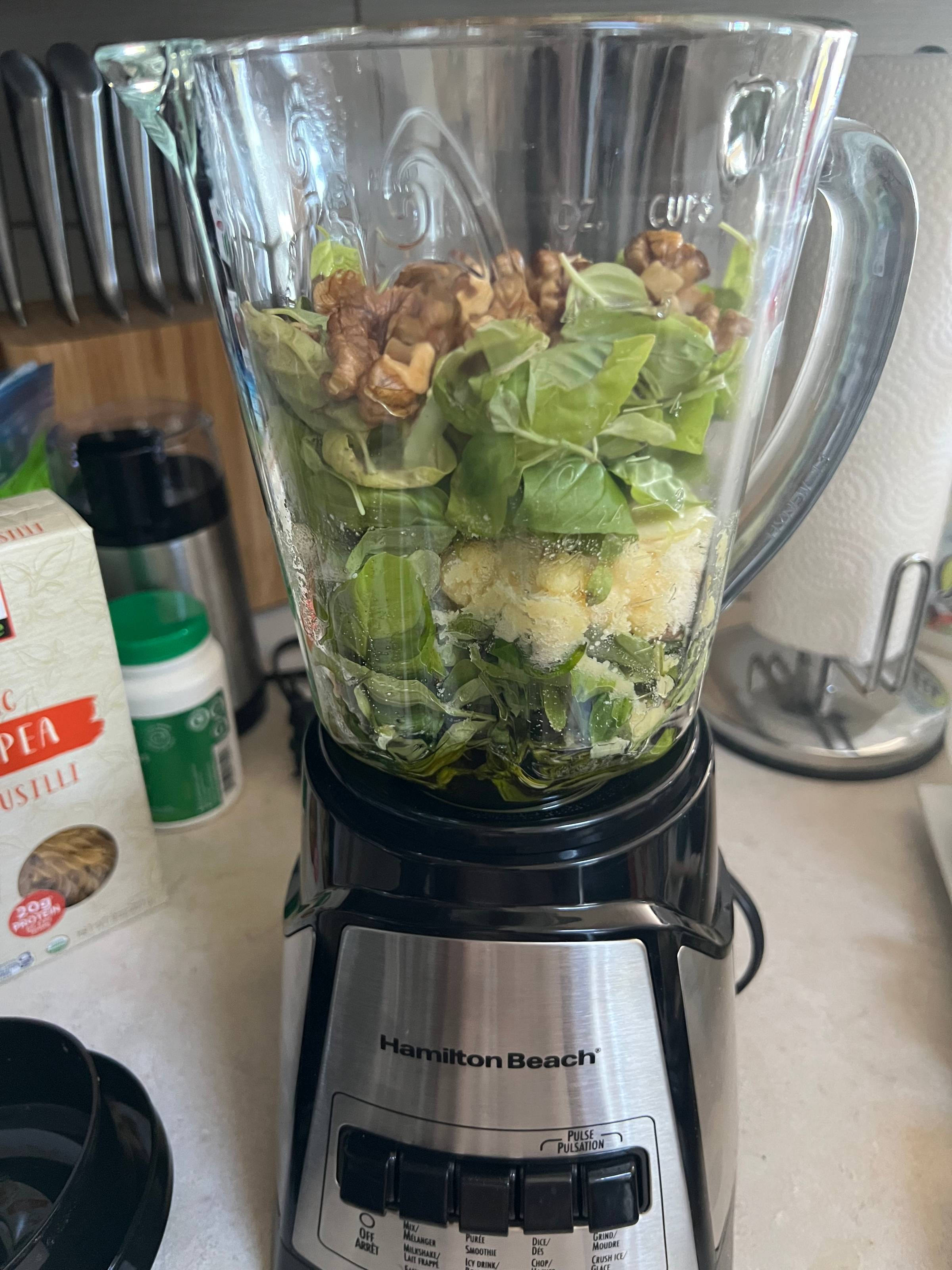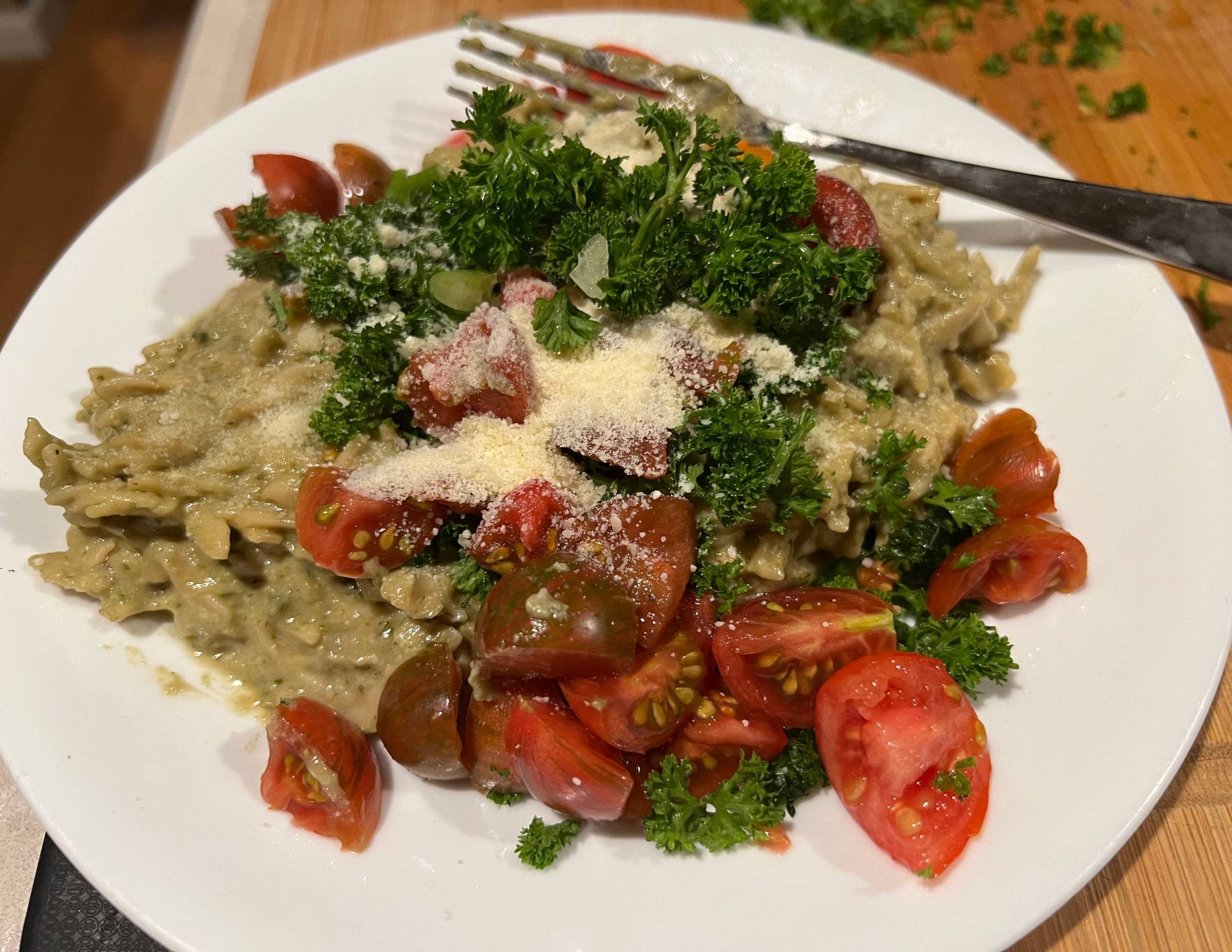 Blend well. Mix with the cooked fusilli in a bowl and serve with organic garden tomatoes and organic parsley with grated or shaved parmesan on top.
