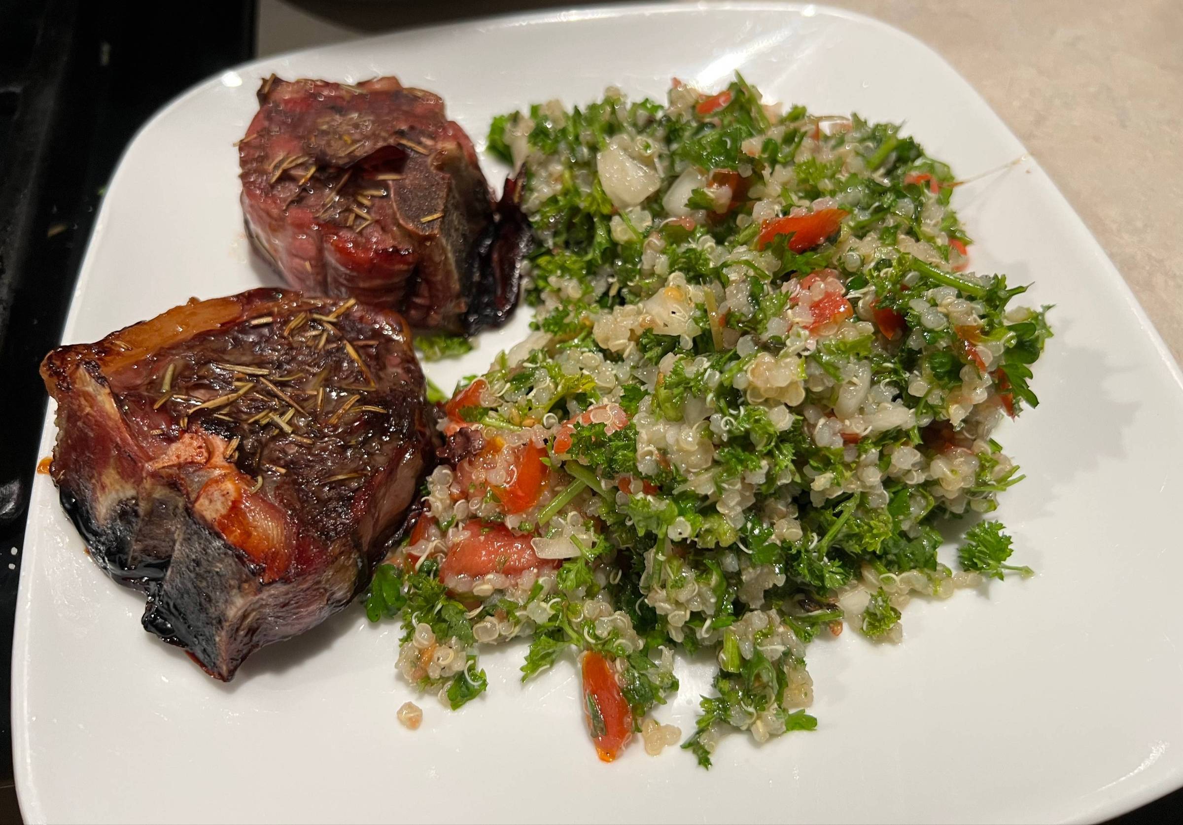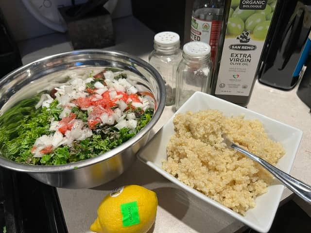 As the quinoa cooks, chop the parsley, mint tomatoes, and onions very finely. Place into a large bowl. Mix equal amounts of the squeezed lemon juice with the same amount of extra virgin olive oil, or less oil if desired.