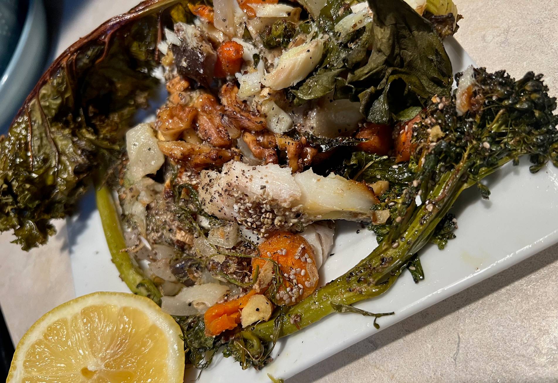 Cook at 375 with dabbed on small pieces of grass fed butter and drizzle with olive oil. Use the gluten free crispy coating with baked walnuts below on the rockfish. Garnish with lime and lemon slices.