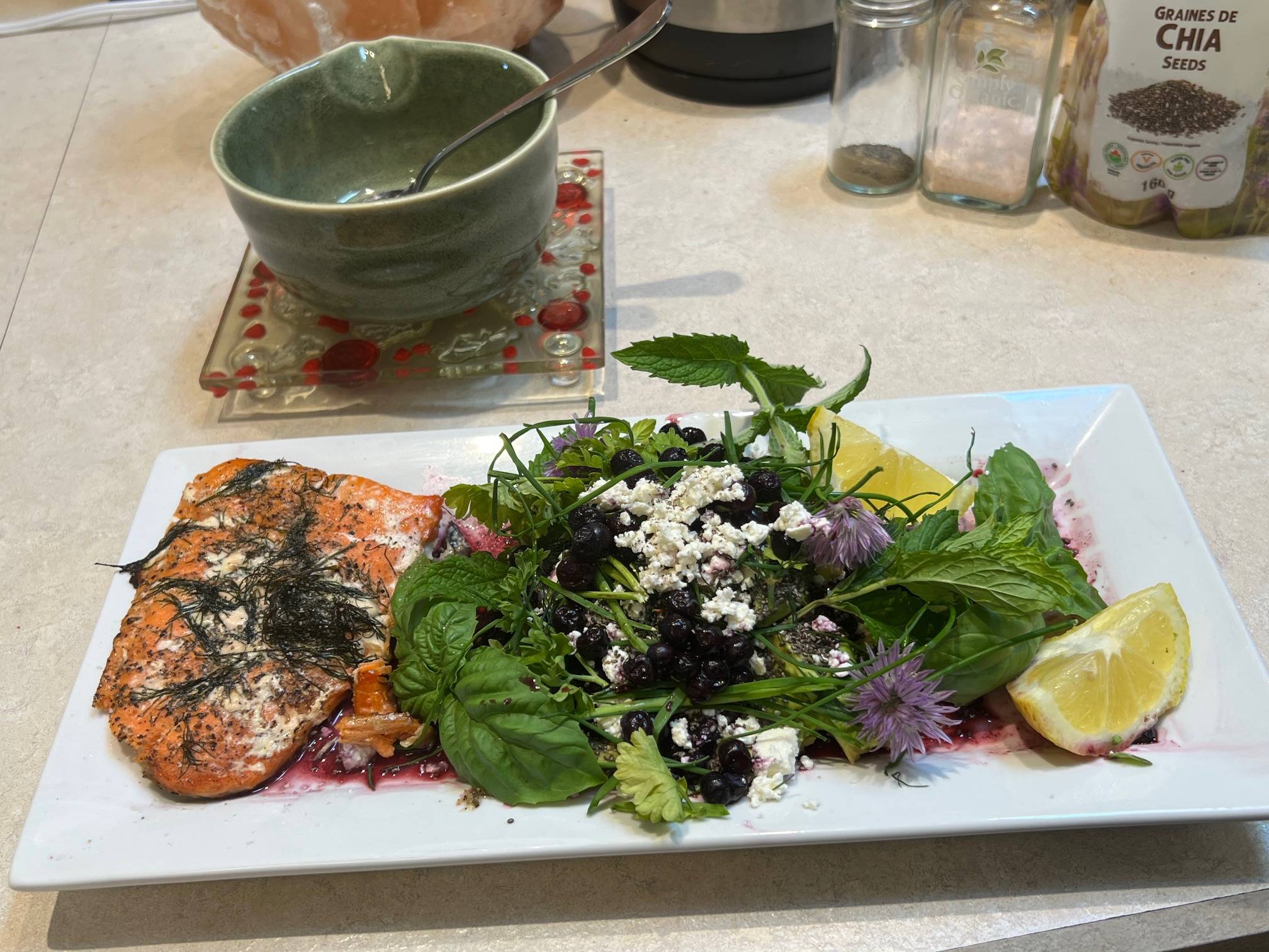 1 1/2 Organic avocado 1/2 cup defrosted organic blueberries with juice 1/2 Organic lemon slices with freshly harvested herbs: Organic garden basil Organic garden mint Organic garden chives with flowers Organic garden dill Organic garden parsley 1 tbsp organic chia seeds Sheep chevre or goat feta as desired Organic Pepper to taste Pour the blueberry juice on to the salad as dressing and enjoy! (Skip the feta and sip on matcha and lemon for weight loss.) Serve with organic lemon slices.