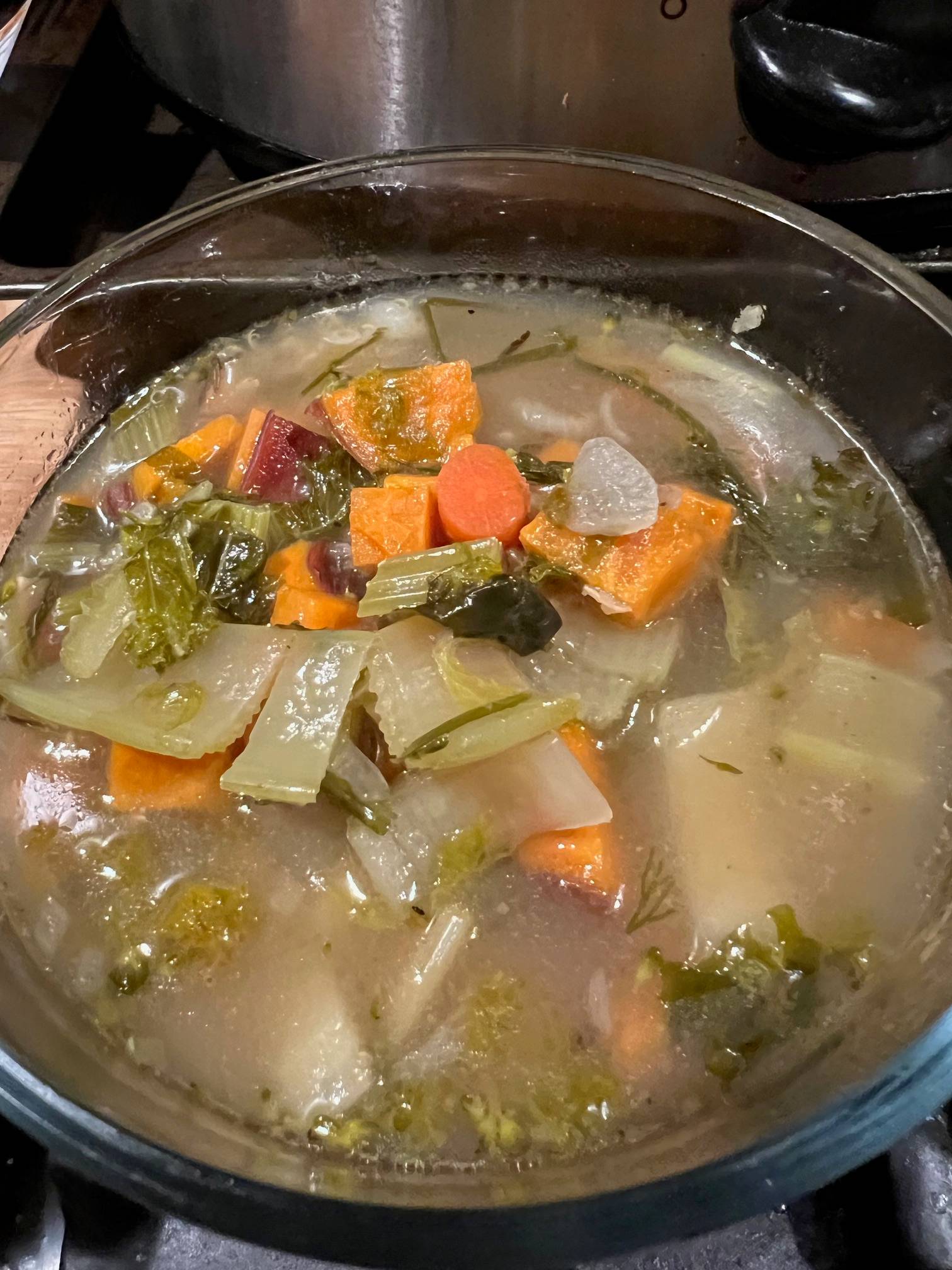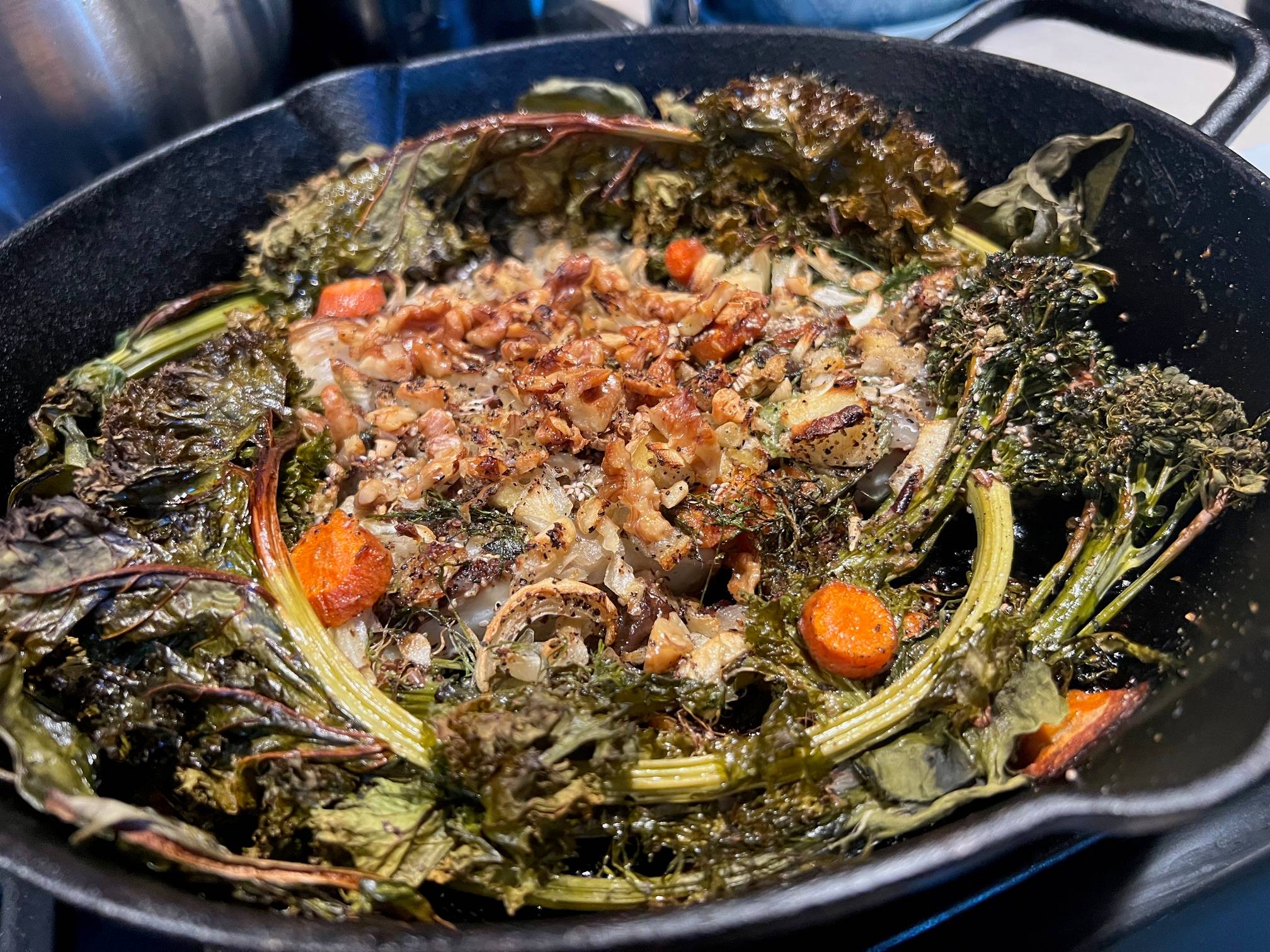 Organic ingredients: kale broccolini swiss chard bok choy carrots dill tarragon chives garlic scapes garlic cubed eggplant sliced onions 1 diced tomato ginger walnuts