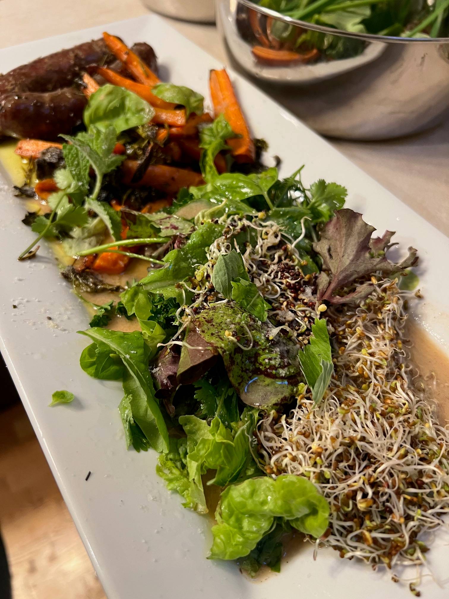 Sprinkle powdered mustard on venison sausages (2 per person, 3 for hungry ones) with organic scapes, chives, parsley, cilantro, tarragon, garlic and sprinkles of celtic sea salt.